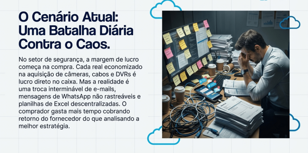 Para você, gestor e proprietário no competitivo setor de Segurança Eletrônica, o lucro real não é gerado apenas na ponta da venda, mas é conquistado na entrada, na aquisição estratégica de seus equipamentos. No entanto, se o seu time ainda está preso em uma batalha diária com planilhas descentralizadas, trocas intermináveis de e-mails e a digitação manual de propostas de fornecedores, você está submetendo sua equipe a um trabalho mentalmente esgotante,.