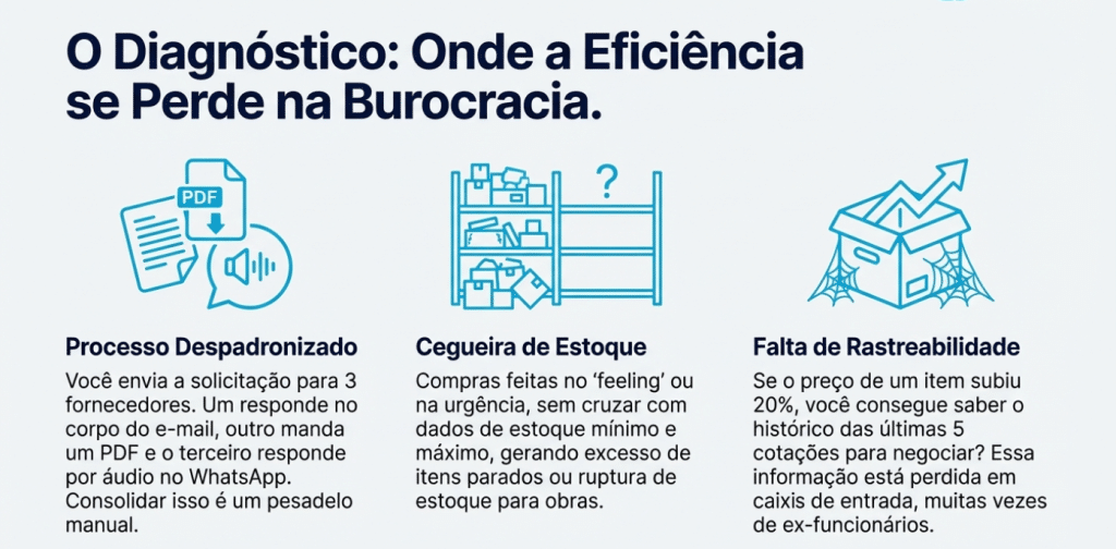- Paralisação Fatal: A demora na aprovação da compra atrasa a entrega do material, paralisando obras e faturamentos.