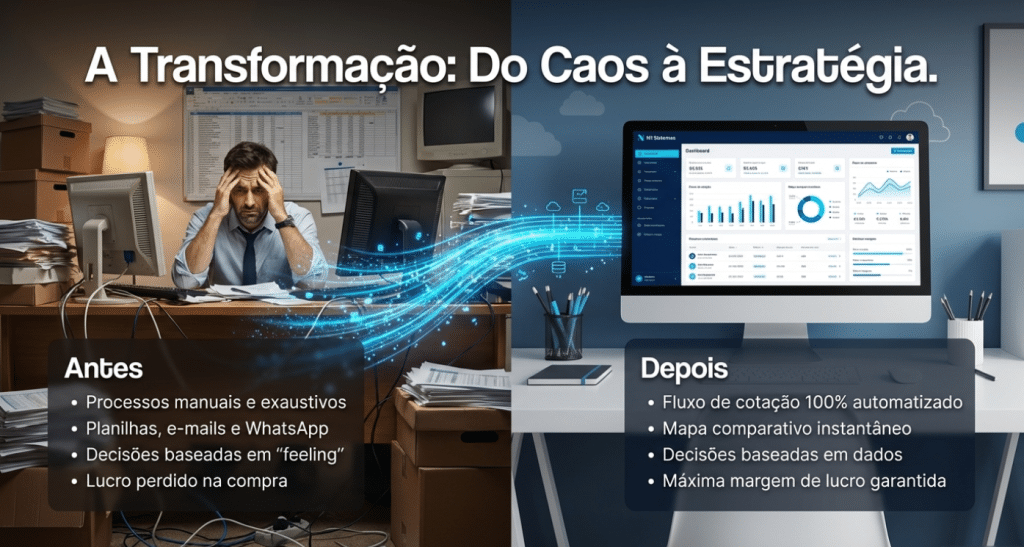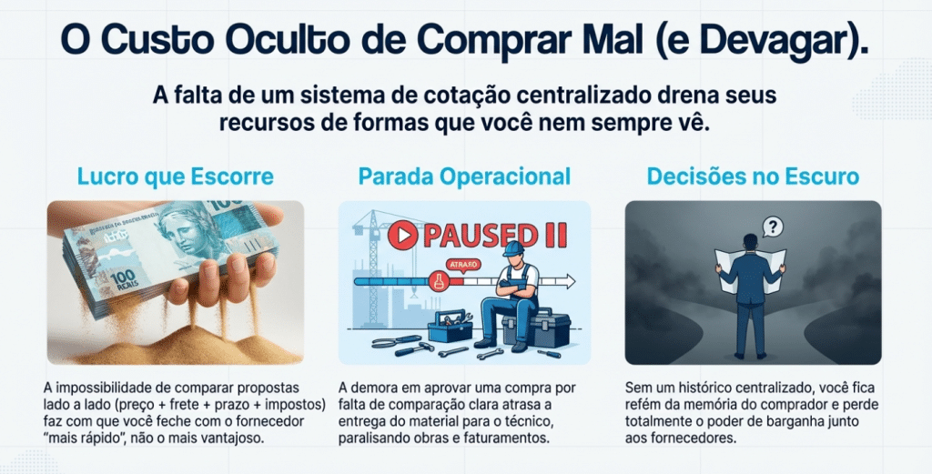 - Lucro que Escorre: Você é forçado a fechar com o fornecedor “mais rápido”, não com o mais vantajoso (que oferece a melhor combinação de preço, frete e prazo).
