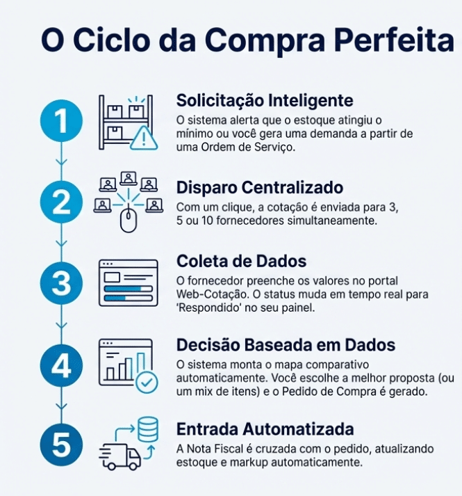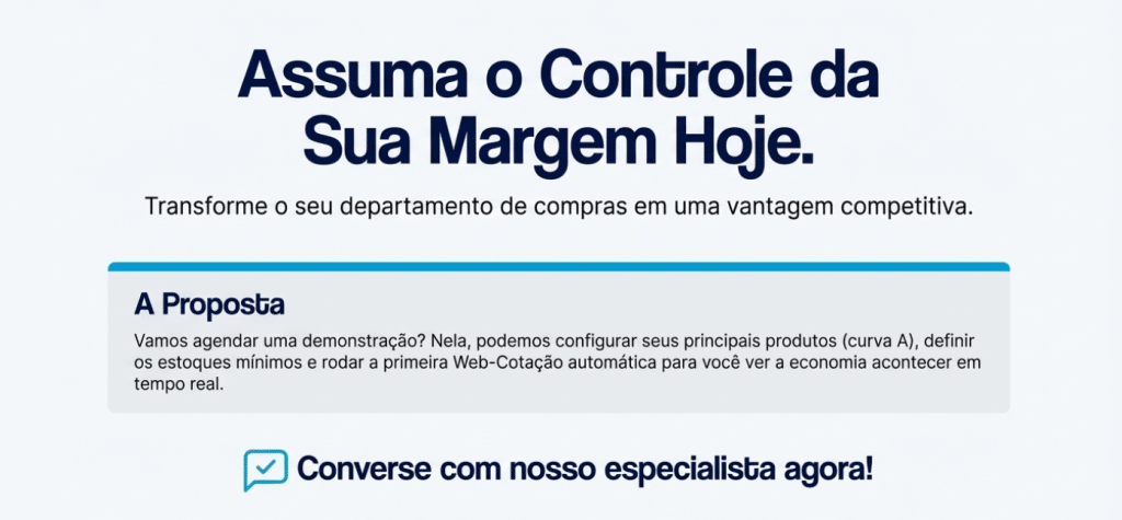 Assuma o Controle da Sua Margem: Vamos configurar seus produtos de curva A, definir os estoques mínimos e rodar a primeira Web-Cotação automática HOJE para você ver a economia acontecer?