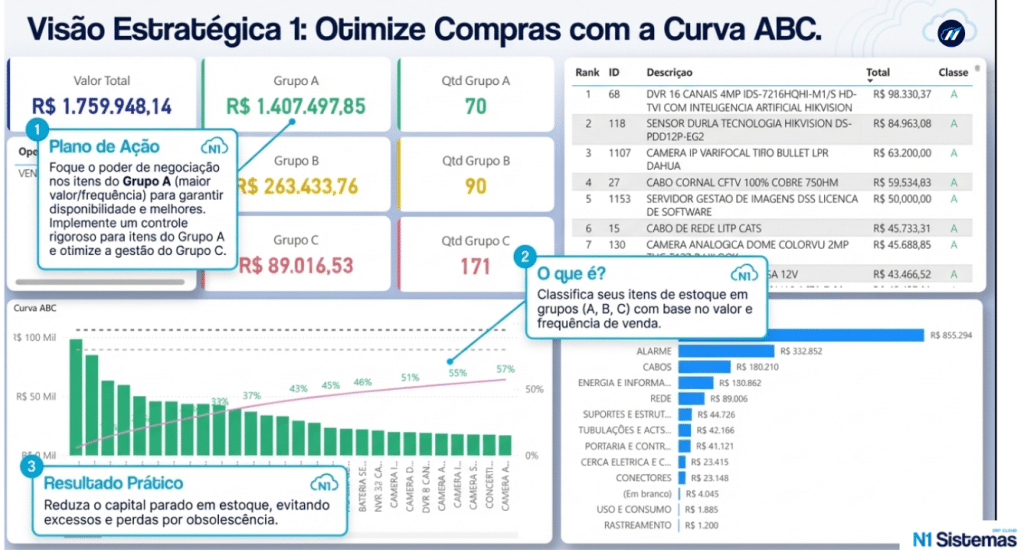 - Controle Cirúrgico de Estoque: Chega de comprar no “feeling”. O sistema cruza a demanda com seu estoque mínimo e máximo e com a Curva ABC, garantindo que seu capital de giro não fique parado em produtos que não giram.
