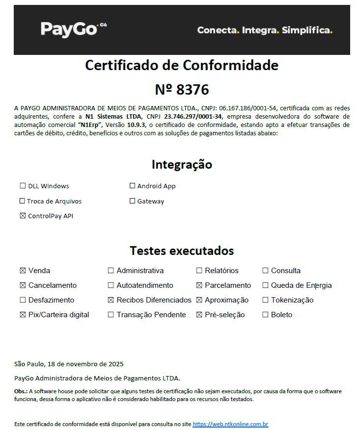 A N1 Sistemas LTDA possui o Certificado de Conformidade № 8376 com a PAYGO ADMINISTRADORA DE MEIOS DE PAGAMENTOS LTDA..