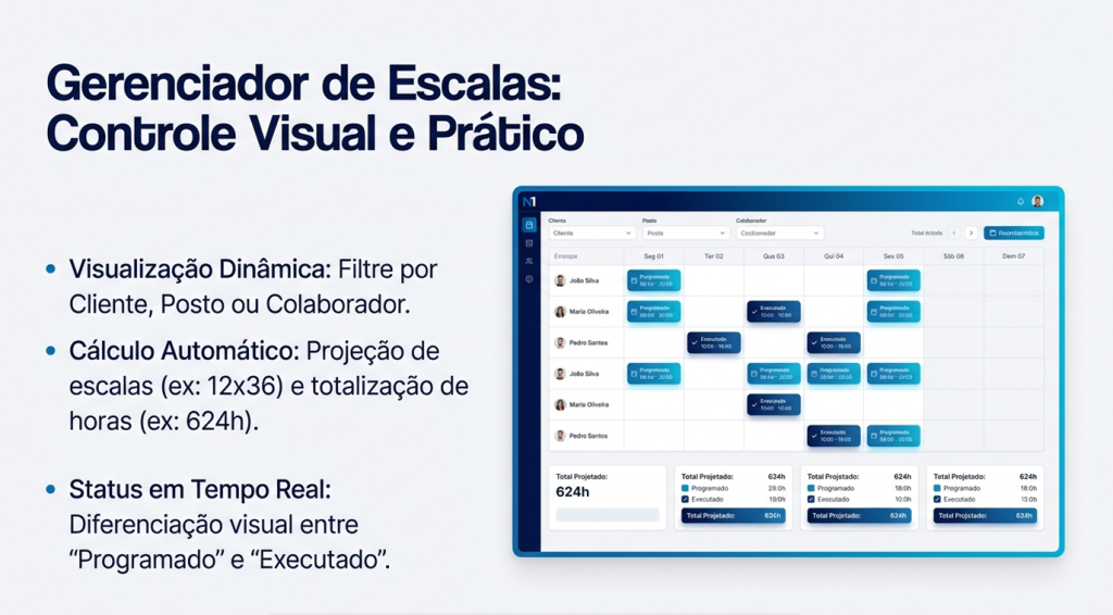Conforme apresentado no fluxo da “Escala Inteligente” no material N1_Intelligent_Facilities_Manag…, o sistema recalcula custos automaticamente ao trocar um colaborador.