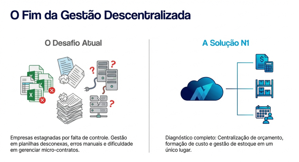 Segundo o material da N1 Sistemas N1_Intelligent_Facilities_Manag…, o maior problema das empresas de facilities é a gestão descentralizada, que impede controle real sobre contratos e escalas.