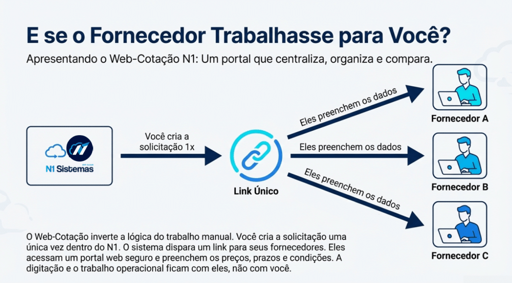 Horas gastas em planilhas e mensagens de WhatsApp para comparar preços são coisa do passado. O Módulo Web-Cotação da N1 Sistemas inverte a lógica do trabalho manual: