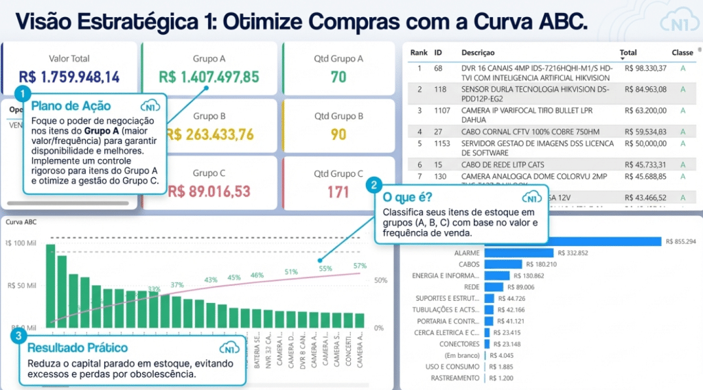O segredo para um estoque lucrativo não é ter de tudo, mas ter o que gira. Com a inteligência do N1 Analytics, sua empresa utiliza a Curva ABC para classificar ativos automaticamente: