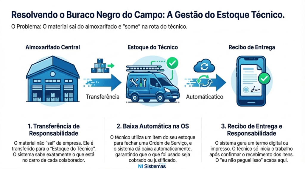 Com a funcionalidade de Mala Técnica, o material não “sai” simplesmente da empresa; ele é transferido para a responsabilidade do colaborador. O sistema gera um recibo digital e o técnico só inicia o trabalho após confirmar os itens. Ao fechar a OS, a baixa é automática, garantindo que 100% do que foi usado seja cobrado do cliente.