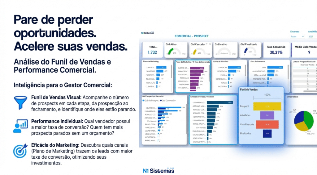 Para crescer, é preciso entender o que acontece no seu Funil de Vendas. O N1 Analytics oferece dashboards interativos que transformam sua equipe comercial em uma máquina orientada a dados: