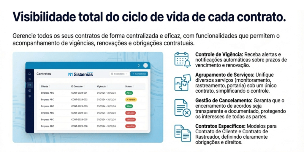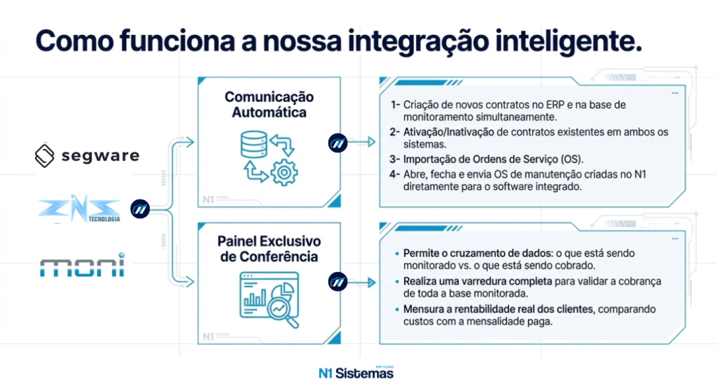 - Integração API Bidirecional: Criar um contrato no N1 gera automaticamente a conta no monitoramento. O Painel de Conferência de Contas cruza dados para encontrar quem está sendo monitorado “de graça”, funcionalidade que se paga no primeiro mês.
