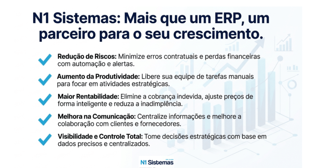 Chegou a era da Gestão de Contratos 5.0. Com o ecossistema da N1 Sistemas, você automatiza o faturamento em lote com apenas um clique e garante que nenhum reajuste de índice passe despercebido. Transformamos o seu administrativo em uma máquina de eficiência, onde o dado flui do contrato diretamente para a emissão de notas e boletos, sem erros humanos e sem retrabalho.