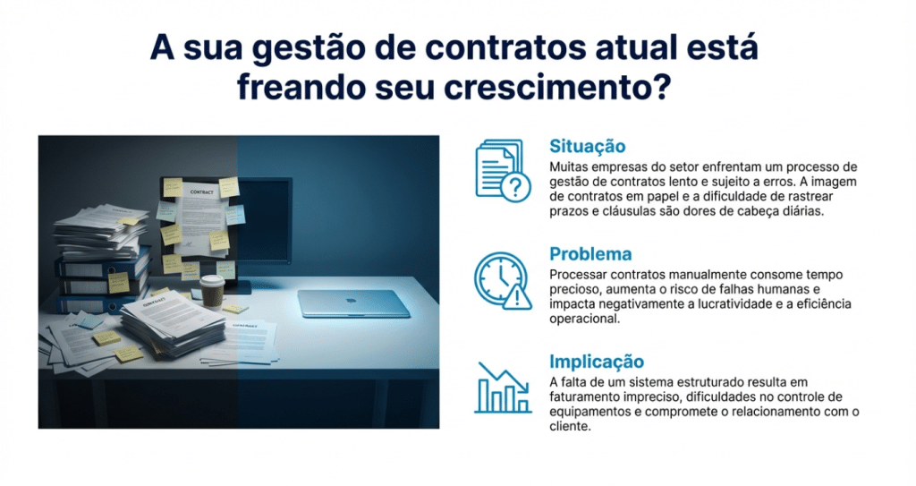 - I – Implicação: O resultado é o “Cliente Monitorado sem Cobrança”. Sem integração, empresas perdem até 90% dessa receita e a falta de reajuste automático corrói a margem de lucro silenciosamente.