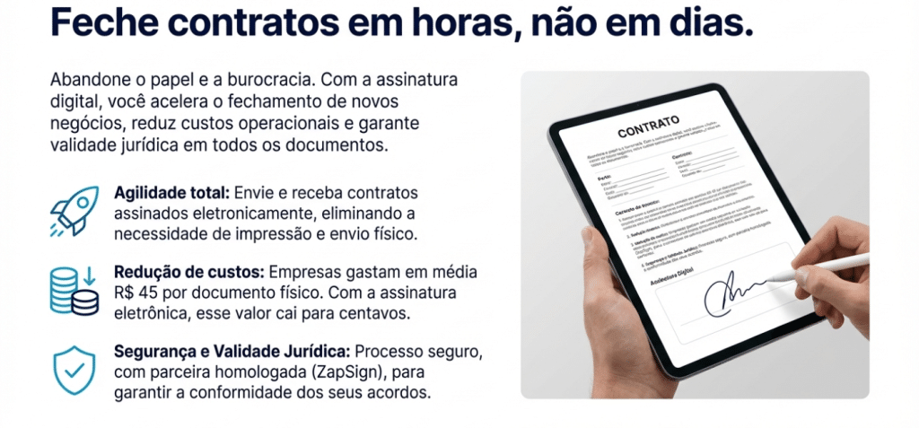 A transição para contratos eletrônicos reduz custos de R$ 45,00 (impressão e transporte) para centavos. Com a integração Zapsign, o contrato é assinado digitalmente com total validade jurídica dentro do fluxo do N1 Sistemas.