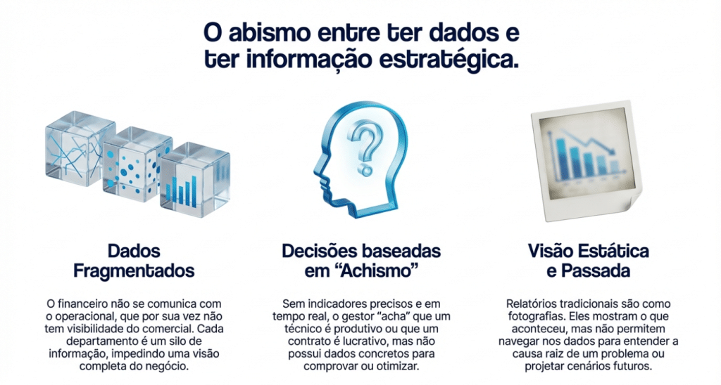 Seu ERP pode emitir notas fiscais e boletos em lote, resolvendo a burocracia, mas ele está gerando inteligência? Se o seu Financeiro não consegue cruzar dados com o seu Operacional em tempo real, você tem dados fragmentados, mas não tem a “big picture”.