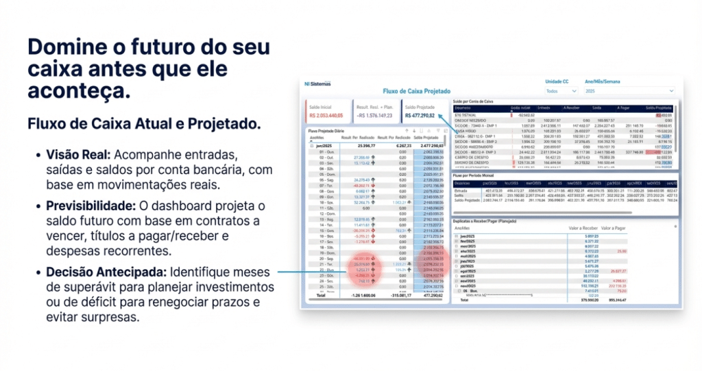 - Surpresas Finais de Mês: Sem o Fluxo de Caixa Projetado, você é pego de surpresa. Não olhar o saldo futuro, baseado em títulos a vencer e contratos ativos, impede que você antecipe a falta de caixa e tome decisões proativas (como adiar compras ou renegociar prazos) meses antes.