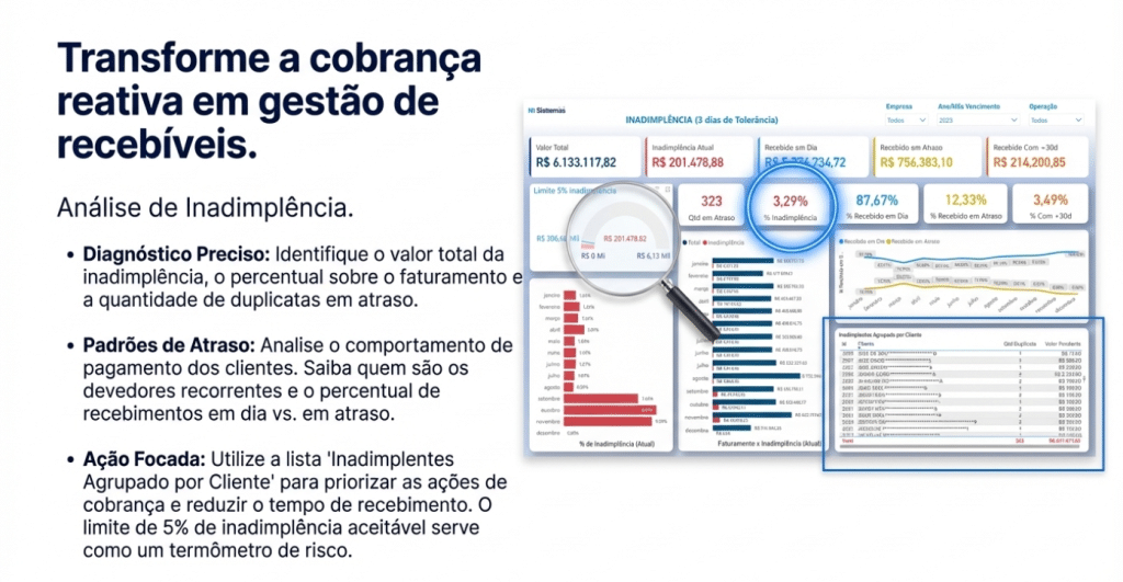 Chega de inadimplência descontrolada! O painel Inadimplência considera uma tolerância de até 3 dias para classificar o pagamento como “em dia” e fornece um “termômetro” de risco para decisões de cobrança. Monitore sua % Inadimplência Atual e assegure que ela permaneça abaixo do limite aceitável de 5%.