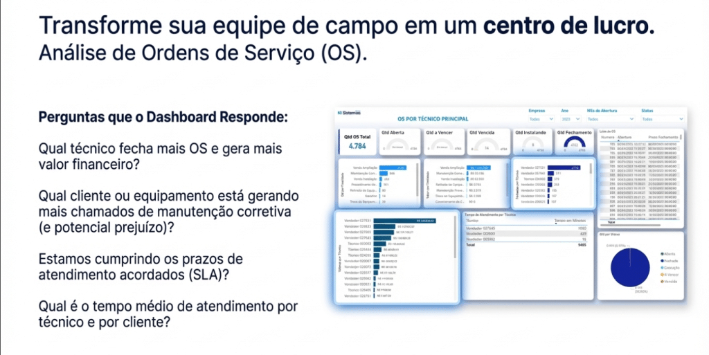 - O Custo Técnico Oculto: Há contratos que pagam para trabalhar? Sem cruzar o custo da mão de obra com o valor faturado, você não consegue identificar se um cliente gera tanta Manutenção Corretiva (prejuízo) que o custo técnico anula sua margem. O BI precisa mostrar o Valor por Técnico e o Tempo de Atendimento para expor essa realidade.