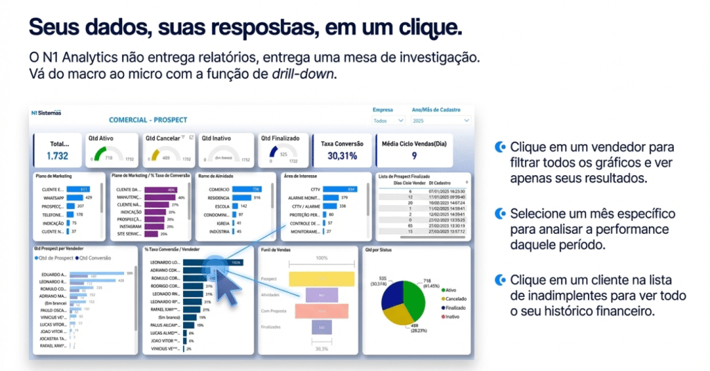 O N1 Analytics (Power BI) não é apenas um sistema de relatórios; é o cérebro da sua operação, o piloto automático que transforma dados brutos em decisões estratégicas diárias.