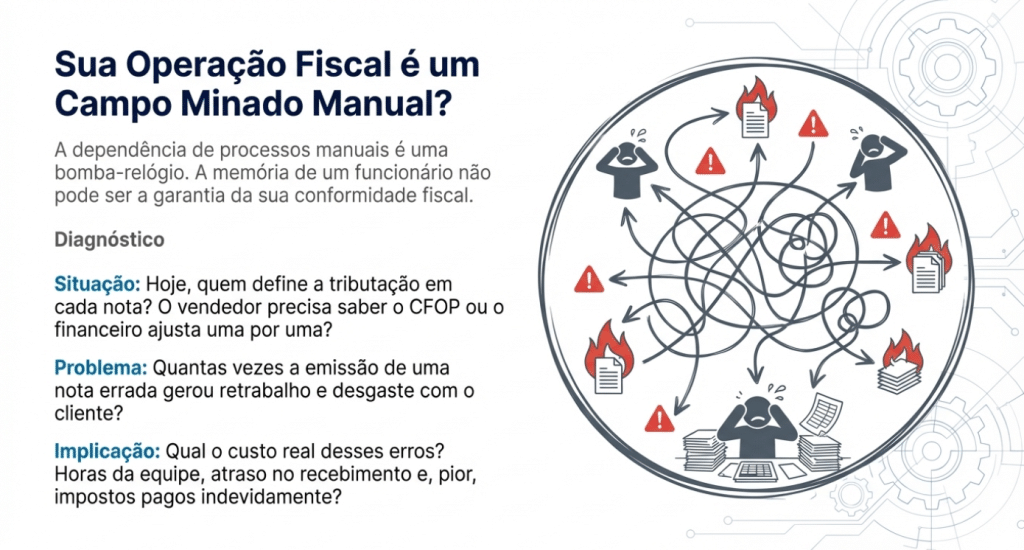 P – Problema: O setor de serviços é intensivo em mão de obra, que não gera créditos tributários no novo modelo de IVA, pressionando diretamente o seu fluxo de caixa. Além disso, a dependência da memória humana para lidar com retenções de ISS e INSS gera um risco altíssimo de emissão incorreta6