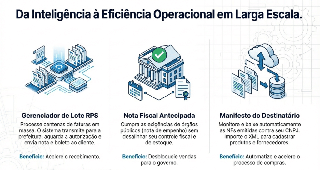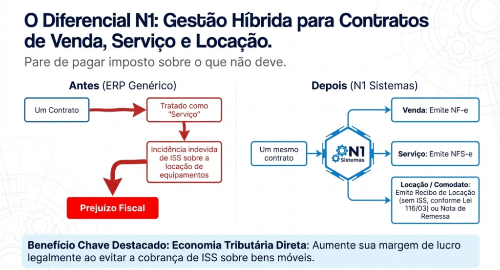 Gestão Híbrida e Economia com ISS: Em um mesmo contrato, o sistema separa Venda (NF-e), Serviço (NFS-e) e Locação. Para locação de bens móveis, emite-se recibos amparados pela Lei 116/03, evitando o pagamento indevido de ISS e aumentando a margem de forma lícita.