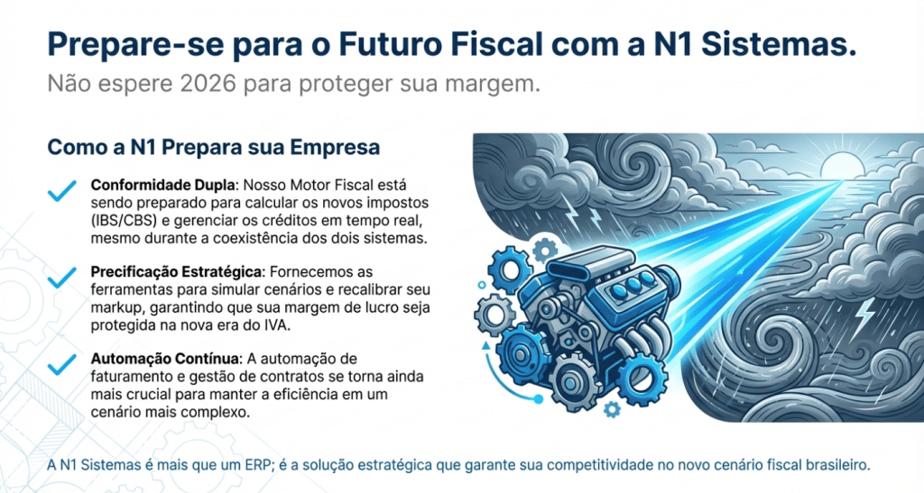 Metáfora de Solidificação: Enfrentar a Reforma Tributária com processos manuais é como tentar navegar em um mar revolto usando um mapa de papel rasgado. O N1 Sistemas é o seu GPS náutico de última geração: ele já mapeou as correntes do IVA Dual e ajusta sua rota automaticamente para manter seu lucro intacto.