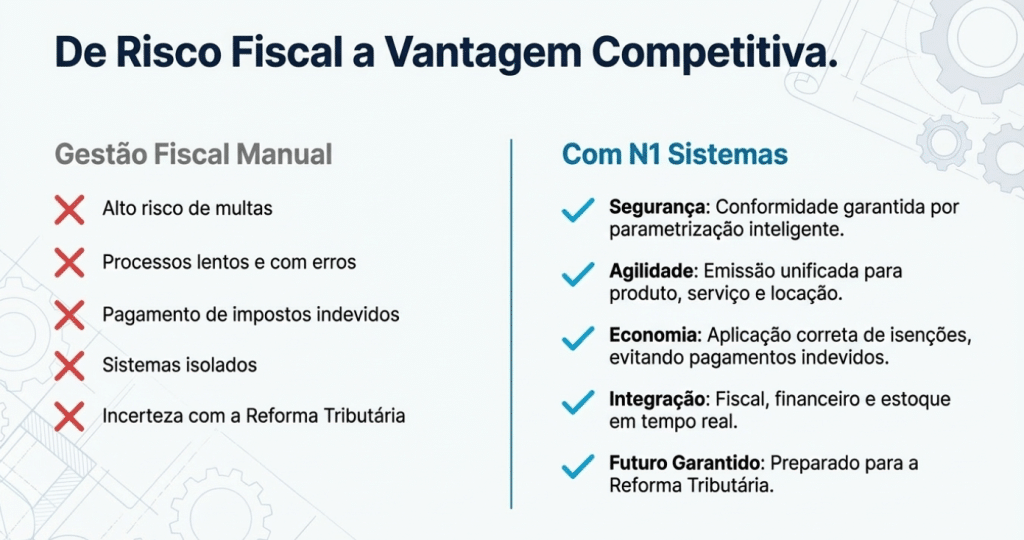 Chegou a hora de implementar uma Gestão Fiscal Inteligente. Com o ecossistema da N1 Sistemas, você automatiza o fluxo tributário integrando o faturamento diretamente à emissão de NF-e e NFS-e, garantindo conformidade total sem depender de intervenções manuais.