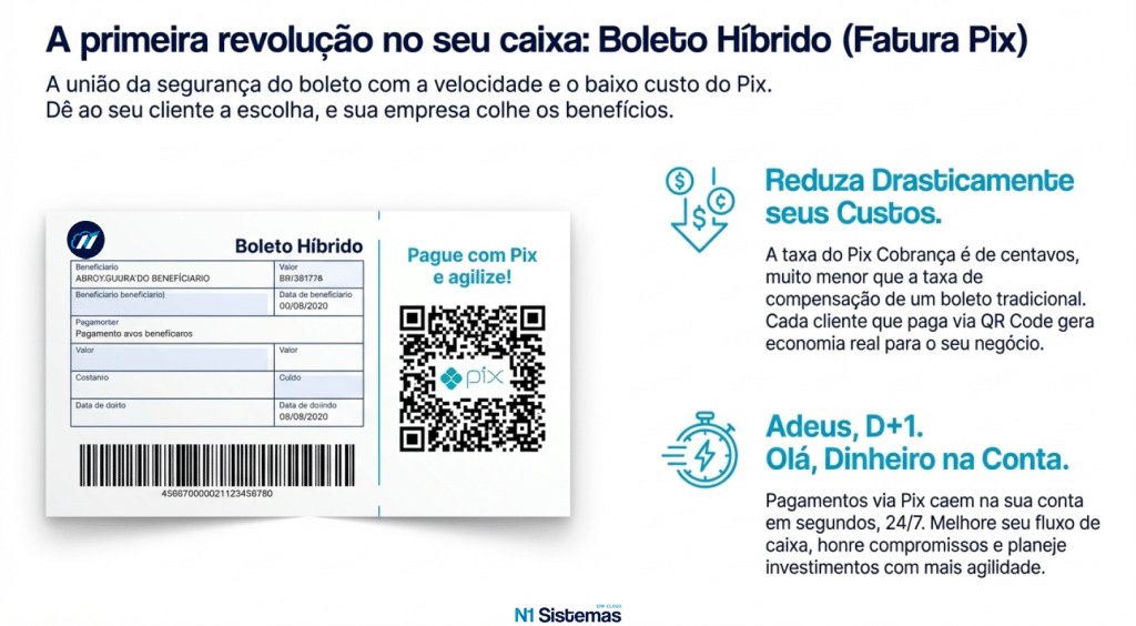 A inadimplência é o maior inimigo da previsibilidade. Para combatê-la, a N1 Sistemas introduziu o Boleto Híbrido (Fatura Pix), unindo a segurança do boleto tradicional à velocidade do Pix. Além de reduzir custos drasticamente (taxas de centavos no Pix), você melhora o fluxo de caixa com recebimentos 24/7.