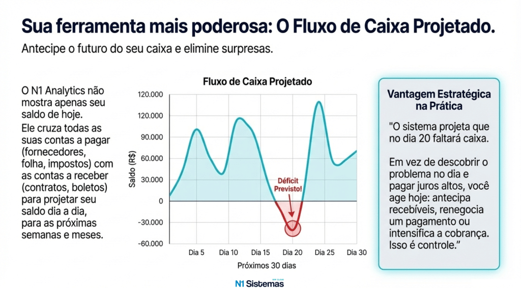 O “pulo do gato” da gestão moderna é o Fluxo de Caixa Projetado do N1 Analytics. Em vez de descobrir um problema no dia do vencimento, o sistema cruza suas contas a pagar e receber (contratos, folha, impostos) para projetar seu saldo dia a dia, para as próximas semanas e meses.