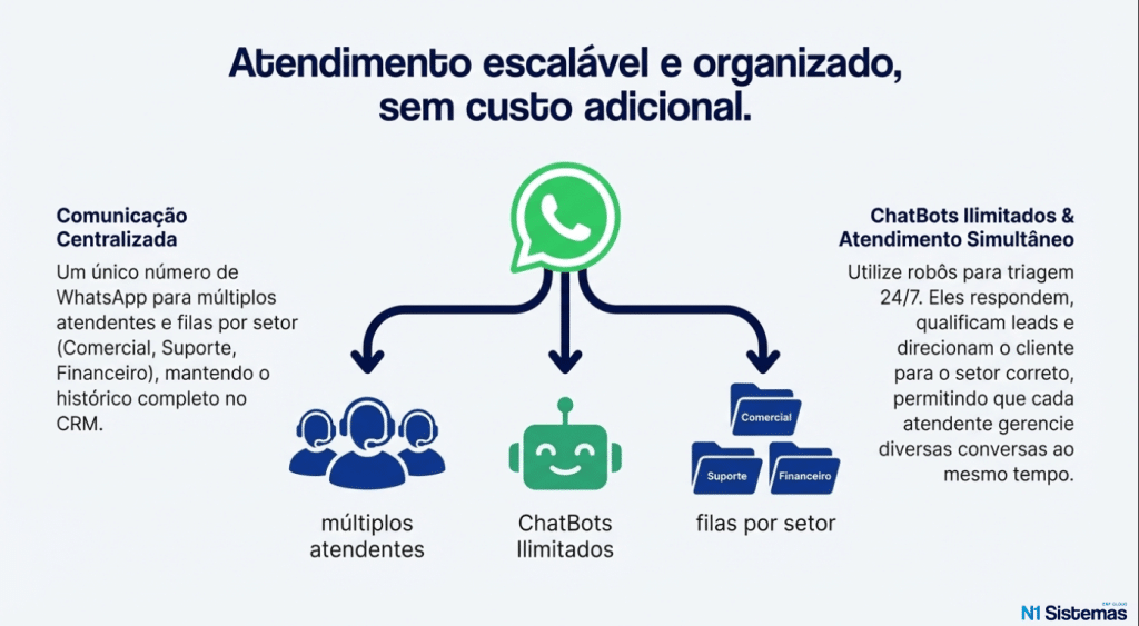 A centralização é a chave para o controle. Através do N1Chat, você utiliza um único número oficial para múltiplos atendentes e organiza filas por setor, como Comercial, Suporte e Financeiro.